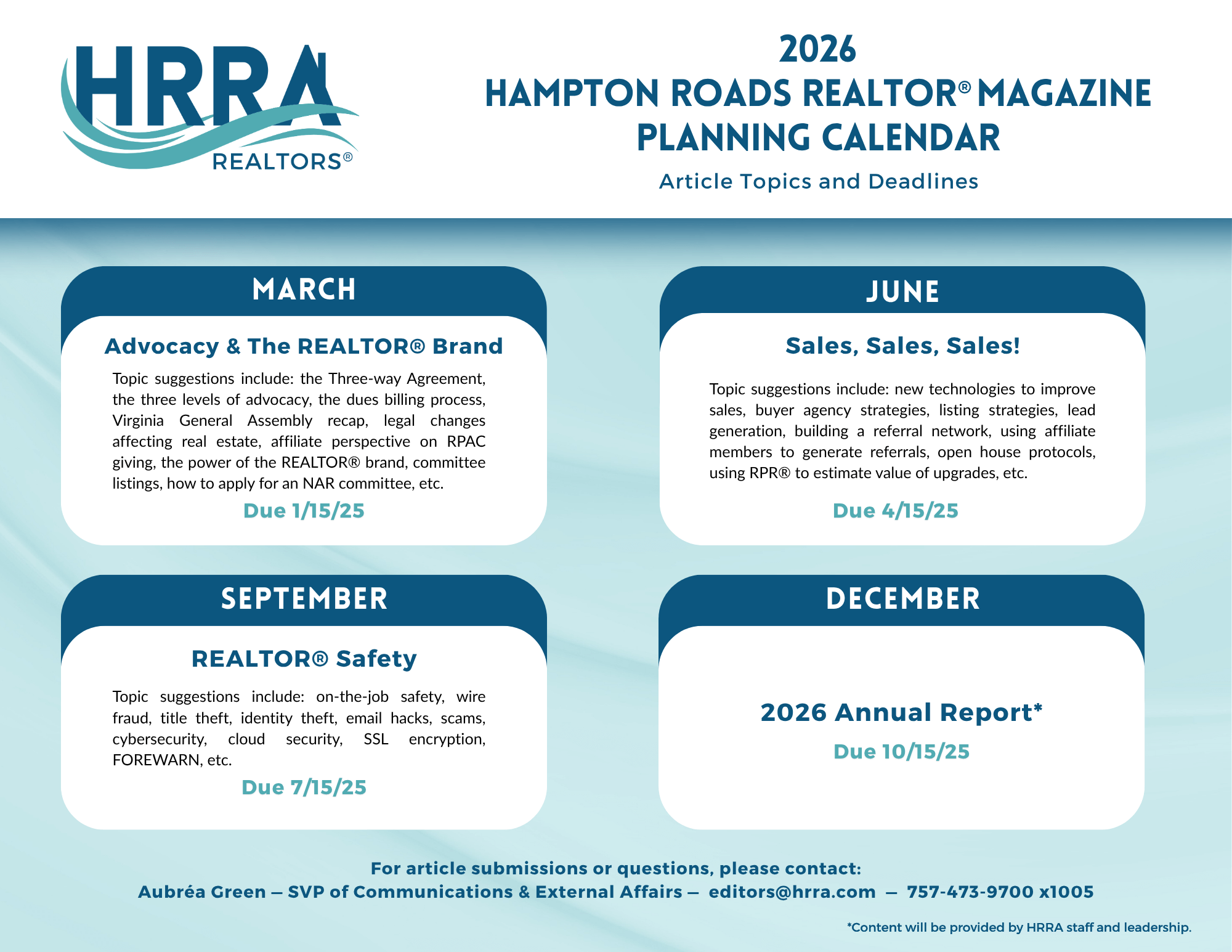 Advertisements in the Hampton Roads REALTOR® are seen by proven leaders who are making today’s business decisions. The magazine serves a clearly defined customer base and offers 100 percent industry penetration. Reaching your target market is easy and economical. For additional information, contact Misty Pritchett, Advertising Sales Executive, at Click Here or call (757) 473-9700 x1006.
